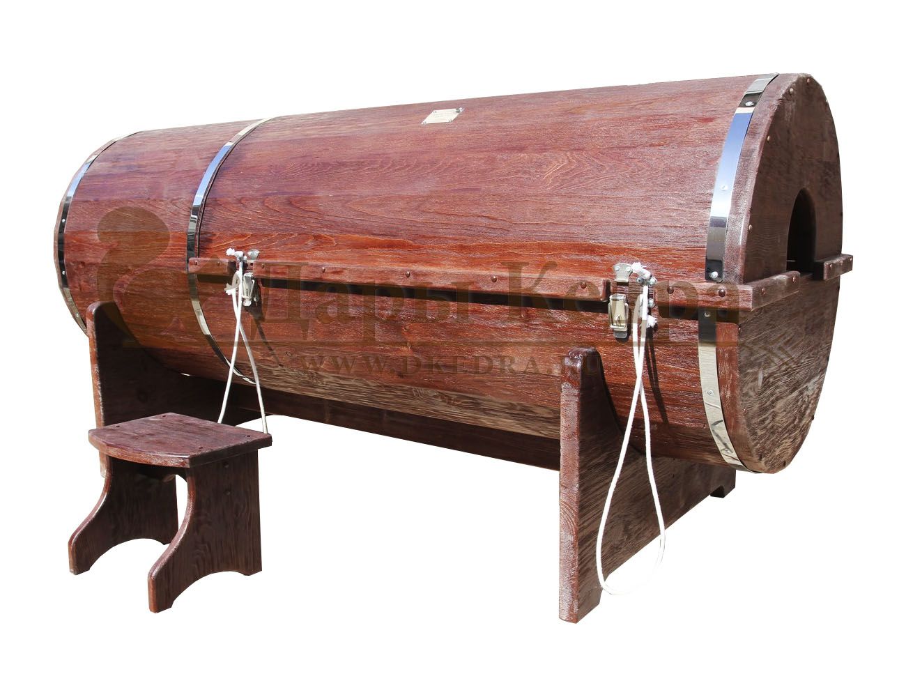 Кедровая бочка (фитобочка) горизонтальная «Профессиональная» Фитобочка горизонтальная из кедра наиболее комфортна в использовании, потому что во время процедур человек принимает лежачее положение. Она оснащена откидной дверцей, которая во время открывания хорошо держится за счет джутовых веревок. Внутренняя ручка из кедра облегчает открывание и закрывании двери во время использования. Такая модель подходит для оздоровительных центров. Парение в фитобочке благотворно влияет на организм в целом: повышается иммунитет, выводятся шлаки и токсины, улучшается работа органов тела и состояние кожи.