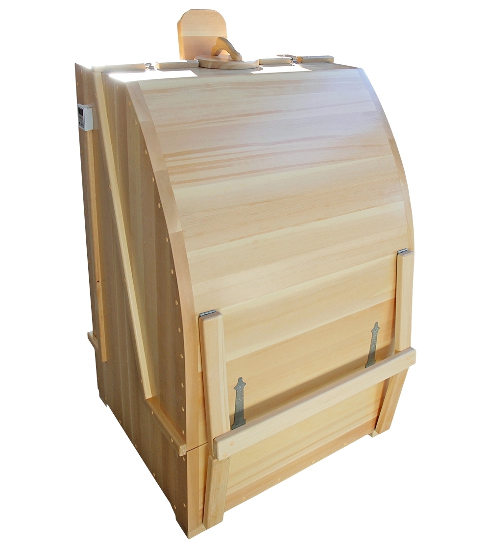 Кедровая бочка (фитобочка) круглая со скосом «Двухрежимная Профессиональная» Фитобочка круглая двухрежимная может быть использована как инфракрасная сауна и парная. Карбоновые излучатели отвечают за сухое парение, они находятся на внутренней стороне стенки. Влажное парение происходит за счет поступления горячего пара в фитобочку через паропровод. Верхний скос изделия улучшает видимость и делает положение головы более комфортным. Бочка оборудована откидными створками, дверцей и отверстием для головы. Во время парения человек сидит внутри кедровой бочки, а голова находится снаружи. Благодаря этому исключается возможность перегрева. Подлокотники из кедра, встроенные ручки на створках и двери делают эксплуатацию более удобной. Парение в фитобочке благотворно влияет на организм в целом: повышается иммунитет, выводятся шлаки и токсины, улучшается работа органов тела и состояние кожи.