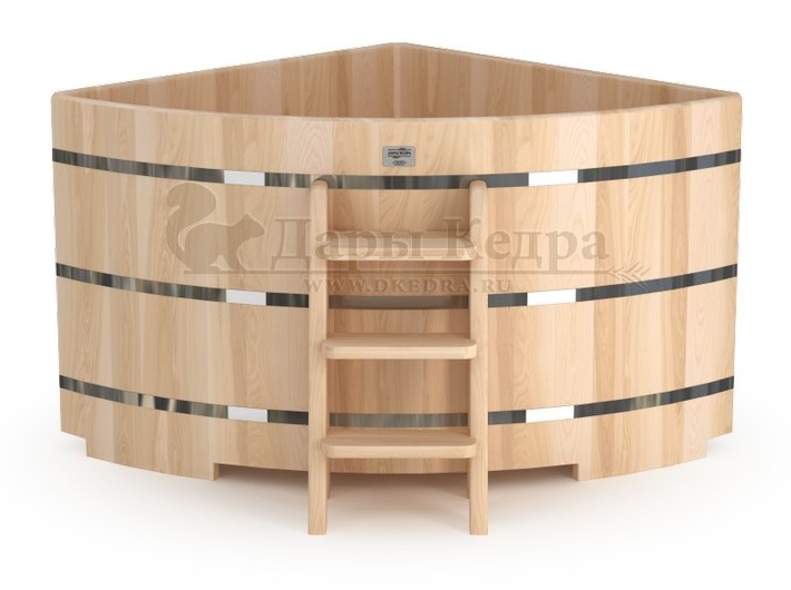 Угловая купель для бани из кедра Это треугольная емкость для воды из кедра. Она предназначена для отдыха и охлаждения тела после банных процедур. Купель устанавливается в угол помещения, что идеально для не больших пространств. Так же подходит для уличного использования. Угловая купель оснащена лавочками, приставной и внутренней лестницей из кедра. За счет стяжных болтов обручи из нержавеющей стали плотно прилегают к кедровой купели. Это позволяет равномерно распределять нагрузку воды и сохранить форму изделия в период эксплуатации. При правильном уходе угловая купель для бани не рассыхается и не подвергается гниению. Обязательно обращайте внимание на ширину дверных проёмов. Если они не позволяют занести изделие в собранном виде, то рекомендуем заказать разборную модель купели, которая оплачивается отдельно. При взаимодействии древесины кедра с водой активируются эфирные масла и фитонциды, благодаря чему организм насыщается полезными веществами.