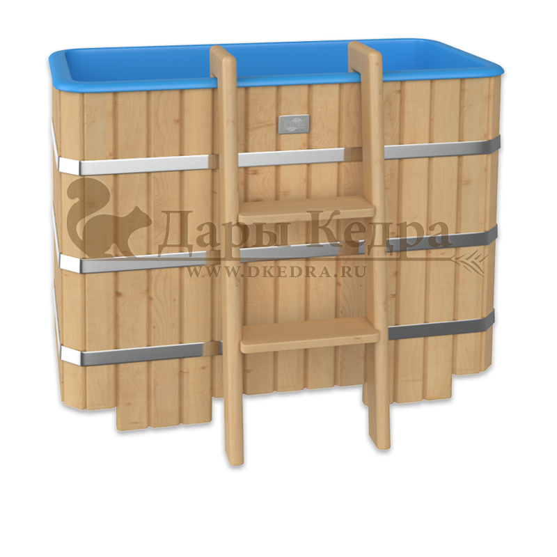 Бондарная прямоугольная купель из кедра с пластиковой вставкой Особенность этой модели заключается в сборке купели по технологии лунный-паз. Паз (углубление) одной доски прочно соединяется с выемкой следующей. Такая сборка осуществляется без клея и гвоздей. Готовая конструкция прочно фиксируется нержавеющими обручами. Пластиковая вставка придает изделию красивый внешний вид, увеличивает срок службы и облегчает уход за купелью. Для удобства пользования купель оснащена лавочками, приставной и внутренней лестницей из кедра. Подходит для комнатного и уличного использования. Купели с пластиковой вставкой рекомендуется заказывать для непрерывного использования в банных комплексах или оздоровительных центрах. Внутренняя чаша облегчает уход за изделием и увеличивает срок службы купели.