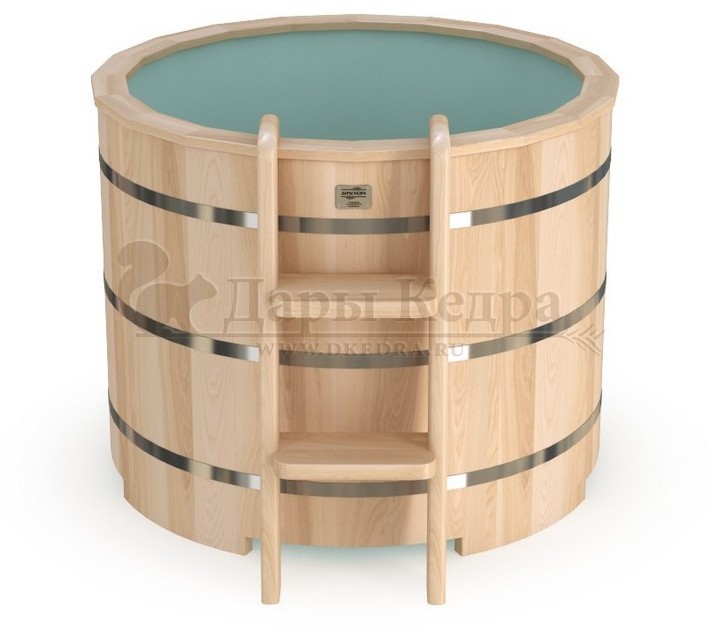 Бондарная круглая купель из кедра с пластиковой вставкой Особенность этой модели заключается в сборке купели по технологии лунный-паз. Паз (углубление) одной доски прочно соединяется с выемкой следующей. Такая сборка осуществляется без клея и гвоздей. Готовая конструкция прочно фиксируется нержавеющими обручами. Пластиковая вставка придает изделию красивый внешний вид, увеличивает срок службы и облегчает уход за купелью. Для удобства пользования купель оснащена лавочками, приставной и внутренней лестницей из кедра. Подходит для комнатного и уличного использования. Купели с пластиковой вставкой рекомендуется заказывать для непрерывного использования в банных комплексах или оздоровительных центрах. Внутренняя чаша облегчает уход за изделием и увеличивает срок службы купели.