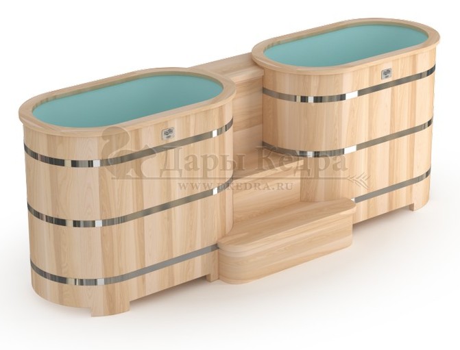 Купель двойная овальная гладкая столярная из кедра с пластиковой вставкой Купель представляет собой две овальные емкости для воды с пластиковыми вставками, в которых люди отдыхают после парения. Между купелями установлен широкий подиум из кедра, по которому могут спускаться и подниматься сразу несколько человек. Для комфортного отдыха купель оснащена лавочками и двумя внутренними лестницами. Двойная купель из кедра с пластиковой вставкой чаще всего используется в крупных банных комплексах и оздоровительных центрах. Внутренняя чаша облегчает уход за изделием и увеличивает срок службы купели.